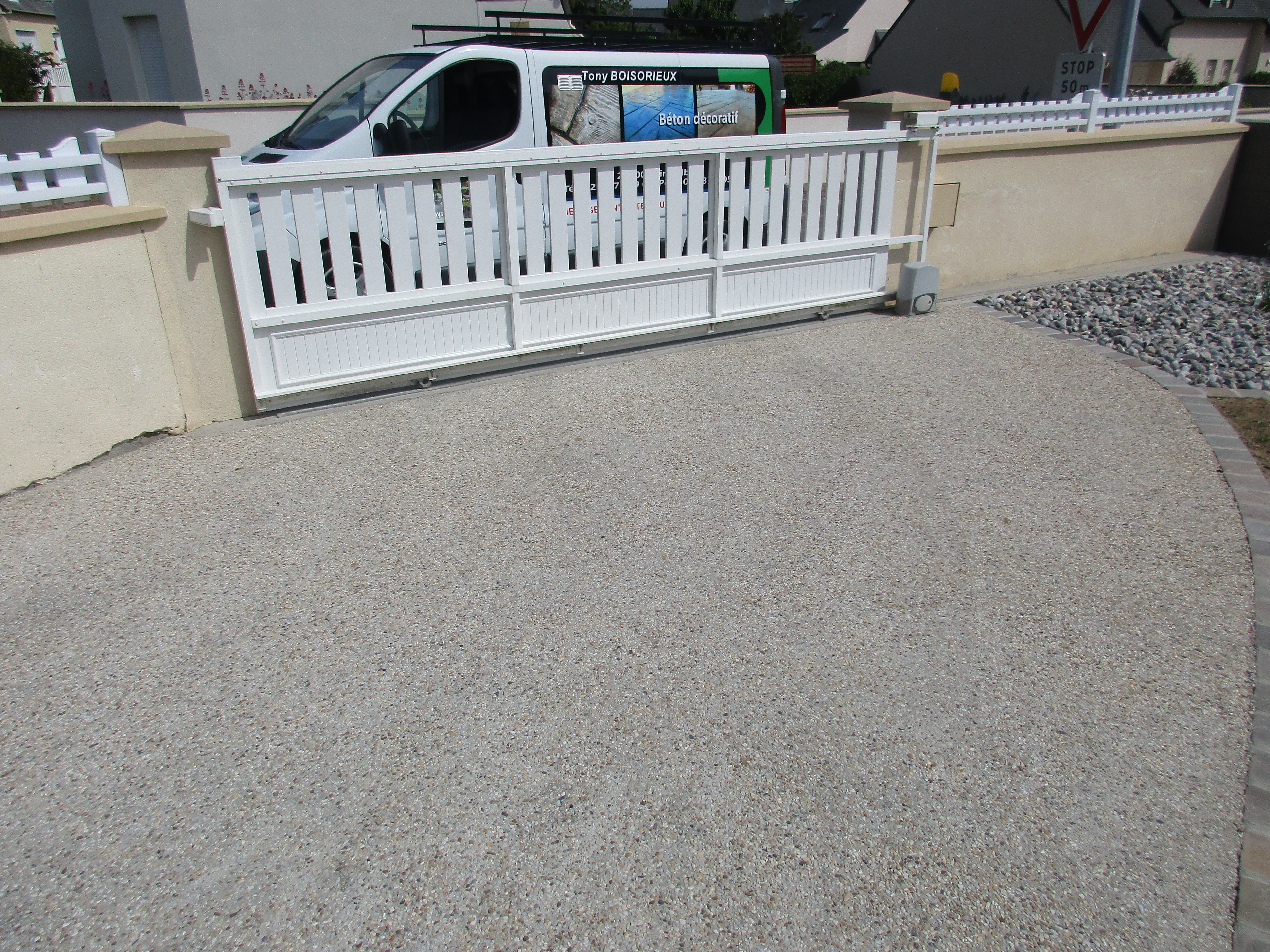 Béton désactivé en gravier beige de Mégrit de granulométrie 6/10.
